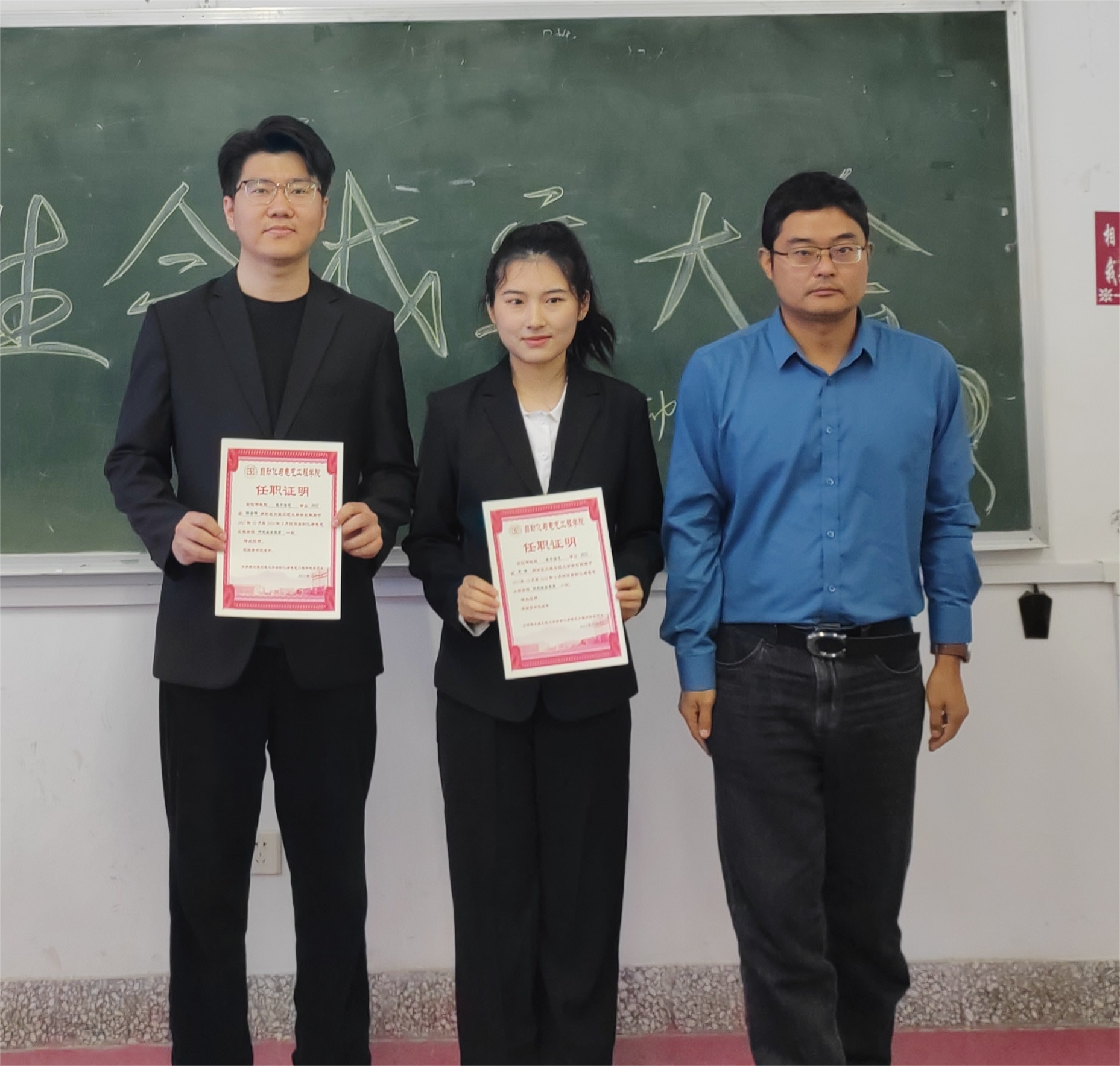 第一届研究生会名单的通知》。程飞和孙贵雄老师分别为本届研究生会主席团成员与部门负责人颁发聘书。新上任的研究生会学生干部的正式上岗,为自电学院的研究生学生工作注入了新的活力,在他们的眉宇之间,是自电学院充满希望的明天。